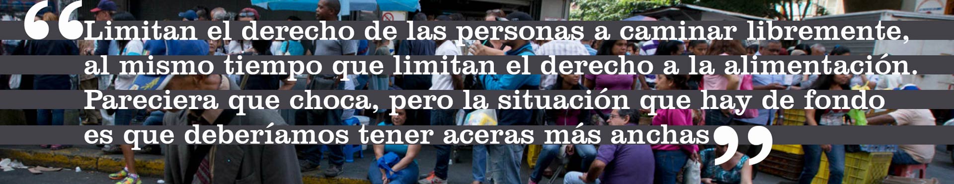 Si mantienen la fila en la principal tampoco mejora mucho la situación para el viandante. “Limitan el derecho de las personas a caminar libremente, al mismo tiempo que limitan el derecho a la alimentación. Pareciera que choca, pero la situación que hay de fondo es que deberíamos tener aceras más anchas, en las que quepa todo, incluyendo las colas que no queremos”, señala Cheo Carvajal, de la asociación civil Caracas a Pie.