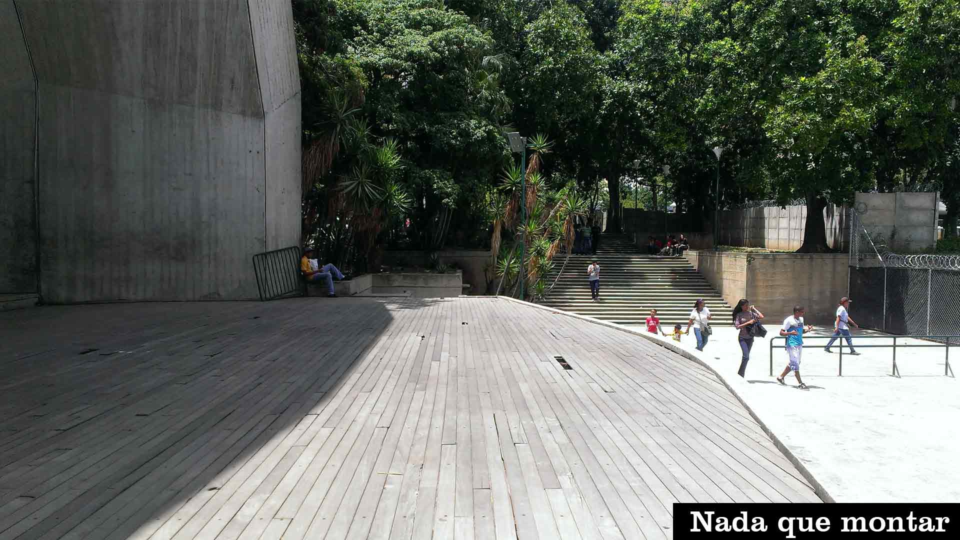 La Concha Acústica es un emblema del parque que se queda sola entre semana. La aprovechan nada más los trabajadores de Inparques que se tienden sobre la tarima en las horas de descanso. Los tablones de madera se hunden a cada pisada; y un par falta. Al fondo, más cerca de la sombra, aparecen los desperdicios: alguno que otro cartón de jugo y envoltorios de chucherías. También al fondo hay una escalinata. Cada nivel tiene varios enchufes, pero la mayoría cuelga de los cables. Pese a todo, los fines de semana sigue siendo una zona fiel para los que quieren quemar calorías.