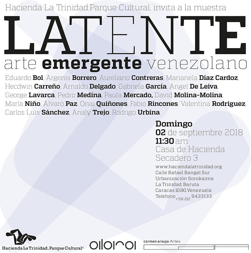 Los espacios de Hacienda La Trinidad Parque Cultural se convierten en punto de encuentro para el arte emergente venezolano. La exposición Latente es el resultado de una importante alianza entre Hacienda La Trinidad Parque Cultural, Galería ABRA y Galería Carmen Araujo Arte, quienes han trabajado unidas para concretar un proyecto que constituya la apertura de nuevos espacios para la difusión del arte emergente, incentivando el diálogo, la confrontación y el reconocimiento entre las nuevas generaciones, especialmente en momentos de tantas dificultades.