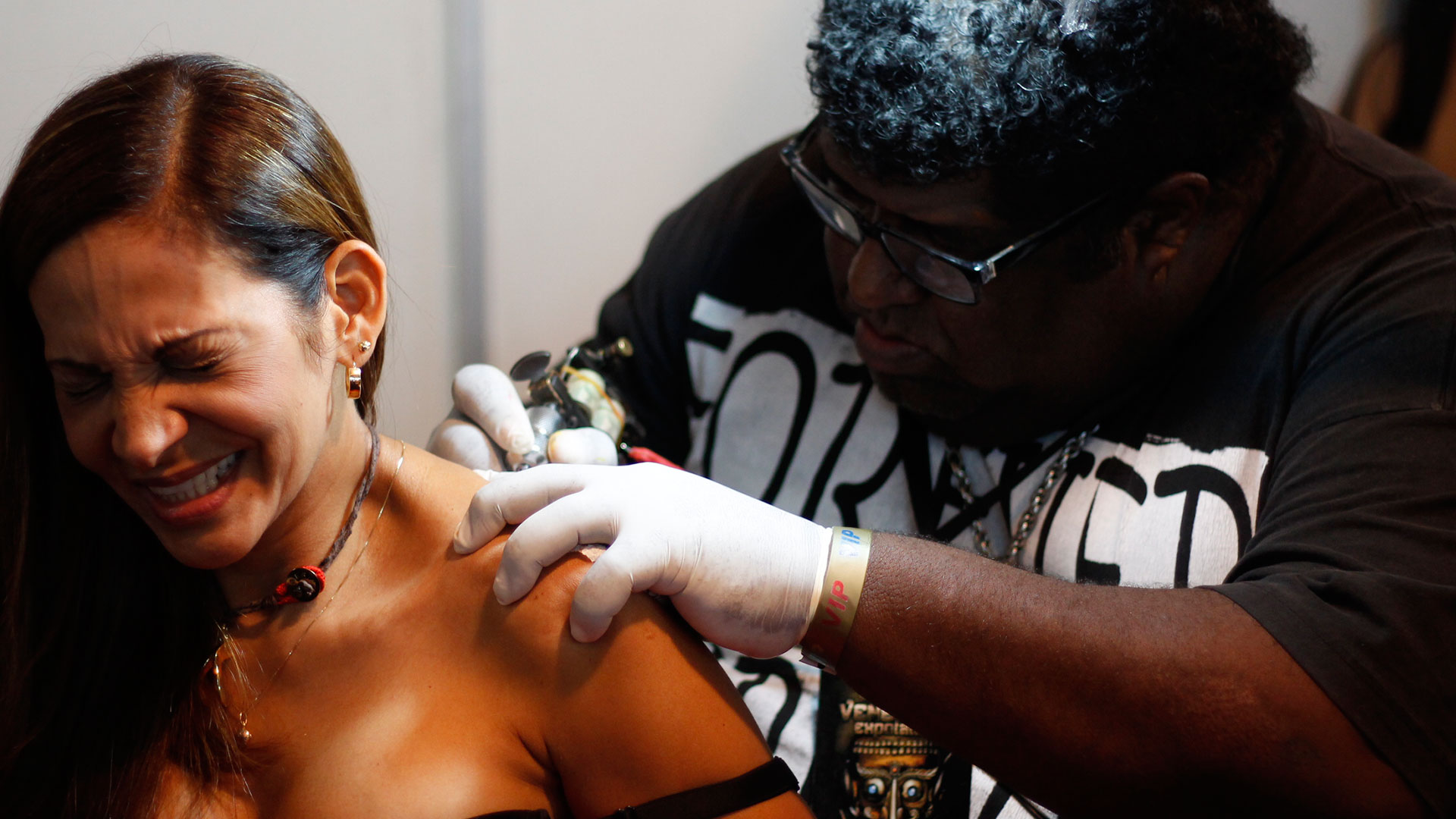 A este show de “fenómenos” se puede acceder una vez que se paga los 1.000 Bs de la entrada de Expo Tattoo. Una exhibición organizada por el famoso Emilio González. Ese personaje imponente y reconocido incluso por la televisión por su sangriento espectáculo de suspenderse por los aires clavándose garfios en los músculos mientras la sangre y los suspiros de asombro corren. El evento aglutina más de 400 toldos en los que, frente contra frente y sudor con sudor, se imprimen las nuevas caras de la metamorfosis. Sus clientes van a su resguardo para tatuarse la piel o hacer alguna otra práctica para muchos de cirujanos o atracciones de variedades. El sonido de las frenéticas agujas de las máquinas que inyectan tinta sirve de musicalización y bienvenida. También el eco espumante de las cervezas recién abiertas. Con ánimos o no de intervención, la atmósfera es parte de este numerito digno de ser registrado por las cámaras de National Geografic para el programa Tabú.