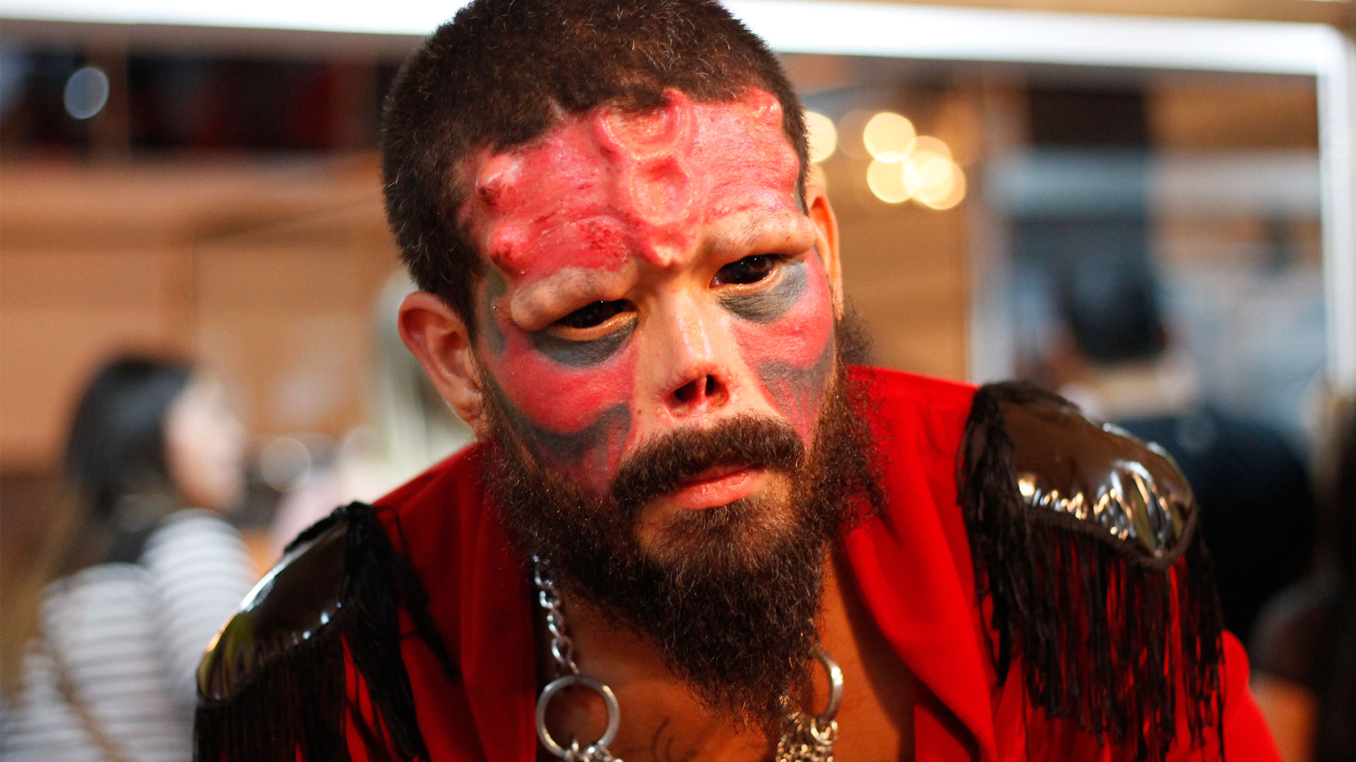 Henry Rodríguez se distingue entre el montón. Se encuentra como modelo de un stand —sus transformaciones le dan trabajo en carnaval y en eventos de este tipo. Tiene un aire de fantasía al de Red Skull, el villano de la cinta Captain America. No pasa desapercibido jamás, ni siquiera aquí. Los niños no temen en jalarle la camisa para llamar su atención. Sus amigos lo chalequean. “¡Berro! Pero no te han dejado descansar. Eres el más popular de aquí”. Sonríe un poco obstinado del asunto. Una chica, más bien simplona y de gordura angelical, le toca el hombro. “Mi amiga pregunta si tienes novia”. Red skull voltea y le pica el ojo. La íntima “curiosa” empuja disimuladamente a la otra y le dice “Zape gato”. Se ahuyenta porque Henry no se parece a ninguno de los galanes que ella había piropeado antes. El “Red Skull” venezolano se retiró el cartílago de la nariz para dejar solo la forma de su esqueleto expuesta. La piel cae en el hueso de calavera. Además, tiene tres implantes redondos en las cejas, dos en cada lado de la frente y tres aros en el medio. Su rostro está teñido de rojo vivo. Y como en sus ojos no hay blanco alguno su interlocutor no sabe adónde mira. Su mirada está perdida en la umbría. Pero él no. Sabe muy bien su destino.