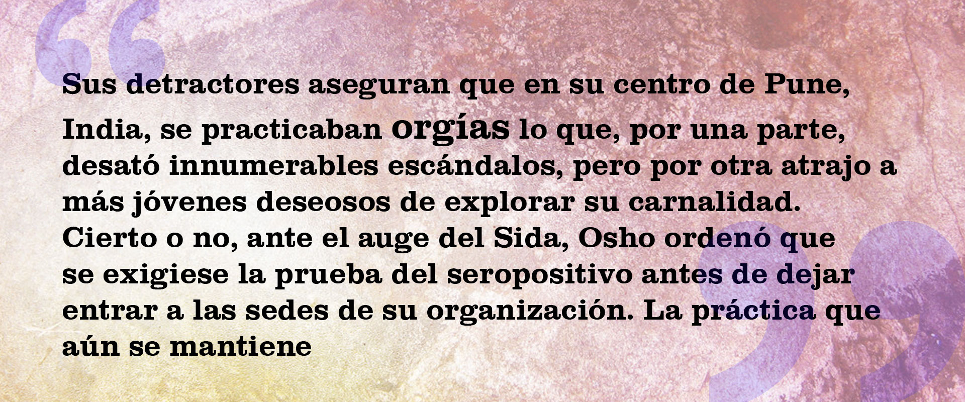 Osho se declaró opuesto ante toda doctrina religiosa y su concepto de meditación rompe radicalmente con el patrón generalizado de estar sentado en silencio, dos nociones que ella descubrirá in situ durante las próximas horas. No es la única que ignora quién fue Osho. En Venezuela pocas personas saben de él y menos llegan a enterarse de los pormenores que rondan la vida de este místico, cuya historia oscila entre una profusa devoción y los más retorcidos escándalos. Y si bien sus libros se venden como arroz, casi ningún lector profundiza en la figura que se esconde detrás del nombre de uno de los pensadores de autoayuda más populares del planeta. Quienes lo hacen se topan con una gran trampa que bien deslumbra o escandaliza.