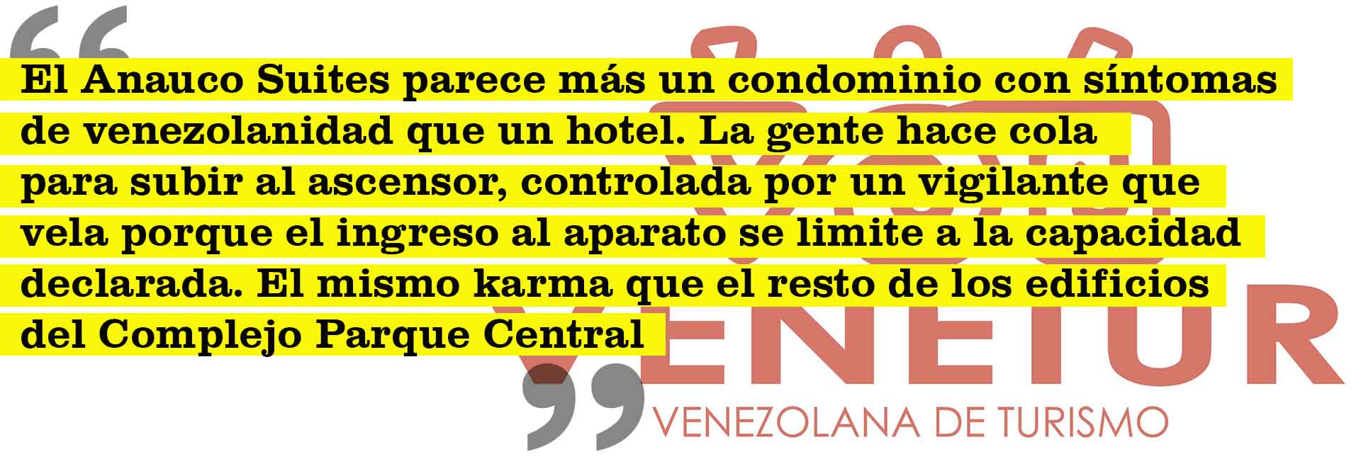 Hoy, el Anauco Suites parece más un condominio con síntomas de venezolanidad que un hotel. La gente hace cola para subir al ascensor, controlada por un vigilante que vela porque el ingreso al aparato se limite a la capacidad declarada. El mismo karma que el resto de los edificios del Complejo Parque Central. También sufre el encierro de sus vecinos. En 2004, se clausuró la conexión interna que tenía con el área residencial, para resguardarse del tránsito peatonal externo. Su funcionamiento quedó delimitado por la vida política: en los pisos superiores habitan funcionarios y personal adscrito a entes gubernamentales, muchas de sus habitaciones se usaron como resguardo temporal de beneficiarios de la Misión Milagro, y en el PH está ubicada la sede del Centro Internacional Miranda, caldo de cultivo de Marea Socialista. Por eso mucha de la disponibilidad de las habitaciones está comprometida y aunque sus empleados aseguran que se puede reservar a través de correo electrónico, no se puede saber con mucha antelación cuáles son las fechas disponibles.