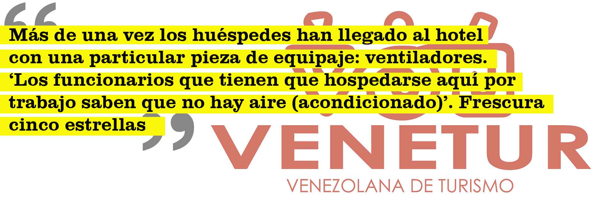 Una empleada del Hotel Venetur Alba Caracas limpia la placa de metal que porta el nombre del edificio rebautizado en 2007, luego de la expropiación por el entonces Presidente Hugo Chávez. La señora hace su trabajo sin reparar en el brillo de las cinco estrellas que aún subrayan el nombre de esta edificación emblema de la vida cultural y económica de Caracas. Pocos visitantes entran y salen de sus instalaciones en plena tarde de jueves, y aunque afuera la brisa caraqueña hace su mejor esfuerzo, en el lobby el calor hace estragos al que permanece unos minutos en la recepción. El sopor se mantiene en los pasillos, en los baños, en los puntos menos favorecidos por las corrientes de aire natural y se intensifica en el piso inferior, especialmente cerca del gimnasio del hotel: ni una brisita de frescura se asoma por las rendijas del aire acondicionado que lleva más de un año sin funcionar. Algunos locales resuelven con su sistema de enfriamiento particular: a punta de ventiladores o con sus propios equipos de aire.