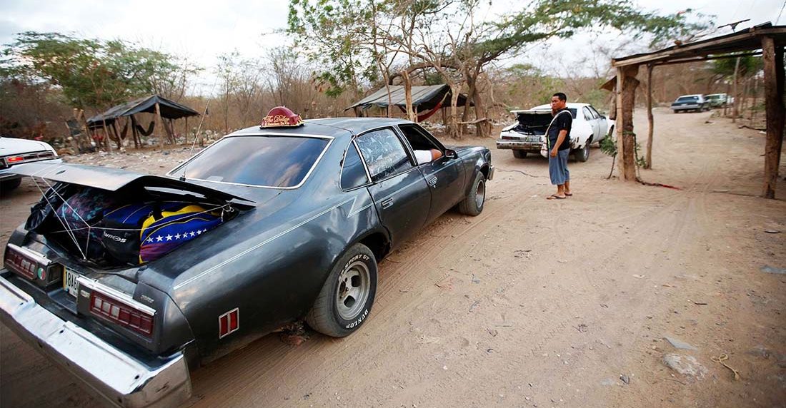 Me arriesgaré a recomponer el rompecabezas de la aventura de M., que empieza estando en Maicao, a diez minutos de la frontera colombo-venezolana, el único turista en kilómetros a la redonda. Ya era de noche, pero las ciudades fronterizas nunca descansan. Sé que compró bolívares a los cambistas de la calle, pero no tengo idea de cuánto, ni a cuánto, supongo que unos veinte mil, vale decir, poco menos de veinte dólares. Entiendo que allí constató el cierre total de la frontera y que no había forma alguna de avanzar, sino recurriendo a los sospechosos servicios de un “Saltamontes”. Ese es el nombre que le dan a los transportistas fronterizos dedicados, cual coyote mexicano, a contrabandear gente de un país al otro en un carro ancho, de esos viejos, tal vez un Maverick o un Falcon destartalado, semejante a los que usaba la dictadura militar argentina para secuestrar dirigentes populares. Espero que a M. no se le ocurriera esa comparación. El pago se hacía por puesto, en efectivo y al instante, y junto a M. subieron al carro otras cuatro personas, en su mayoría colombianos residenciados en Venezuela, gente a la que el cierre separó de familiares, trabajos o rutinas completas de vida. Por suerte le mostraron un poco de cordialidad. Entiendo que el precio fijado era de diez mil bolívares y que, cancelados los aranceles, el saltamontes abandonó la ruta y se internó en una trocha agreste, que serpenteaba en la serranía de Perijá, extraviándose rápido en La Guajira.