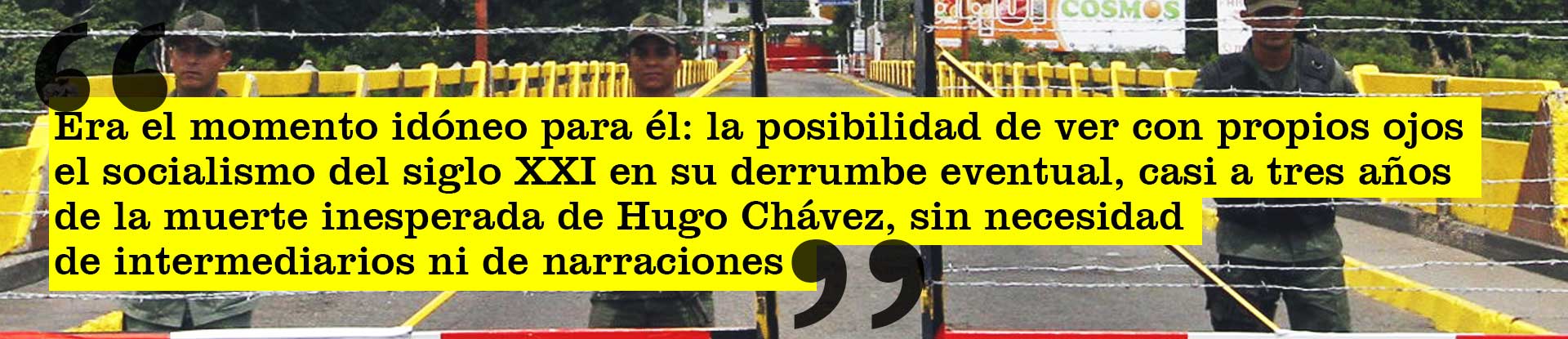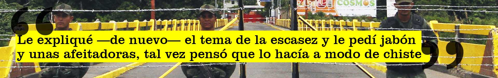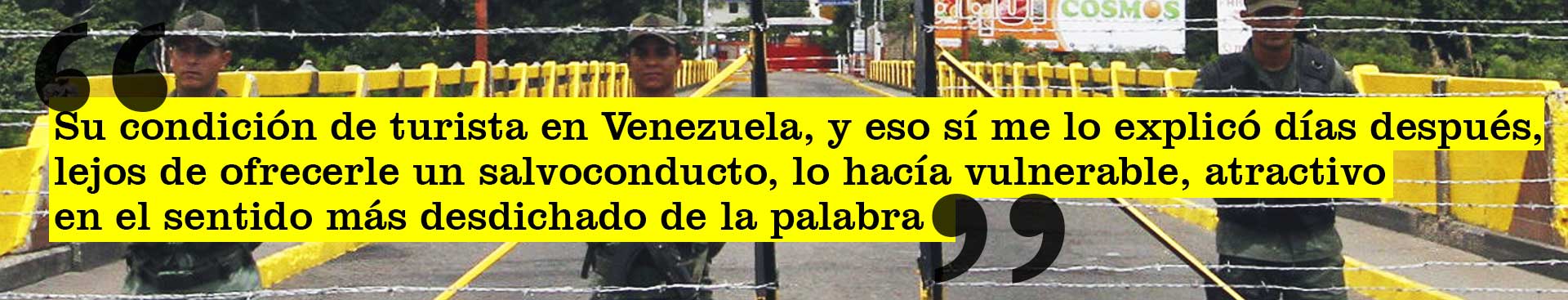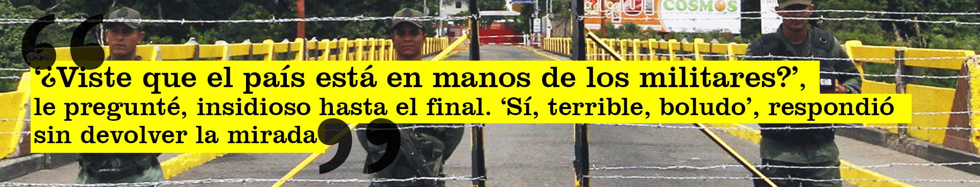El relato del tránsito de M. por la frontera lo supe mucho rato después, cuando ya estábamos reunidos comiendo pescado a la orilla de la playa en Morrocoy. Ya los paisajes lo habían reconciliado con el país, con el mundo, con la vida, aunque sostenía no querer volver a Colombia por tierra “ni en pedo”. Hasta entonces no había querido hablar mucho del tema y cuando lo increpé lo hizo rápido y sin demasiados detalles, no sé si avergonzado, resentido o simplemente queriendo exorcizar del resto del viaje las amarguras. Era lógico, después de todo, y no sé si yo habría conservado los ánimos en su lugar. De nada valió que insistiera, en distintos contextos y en más de una oportunidad, intrigado y también temeroso del recuerdo nefasto que se llevaría de Venezuela. “No quiero revivirlo”, me dijo y me dice todavía cuando le pregunto. Pero cuando volvimos a Caracas, después de tres días de playa, y pasábamos las numerosas alcabalas de la Guardia Nacional en la carretera, lo vi en el retrovisor encoger el rostro en un gesto parco de disgusto, nada cónsono con la sempiterna alegría que lo caracteriza. “¿Viste que el país está en manos de los militares?”, le pregunté, insidioso hasta el final. “Sí, terrible, boludo”, respondió sin devolver la mirada.