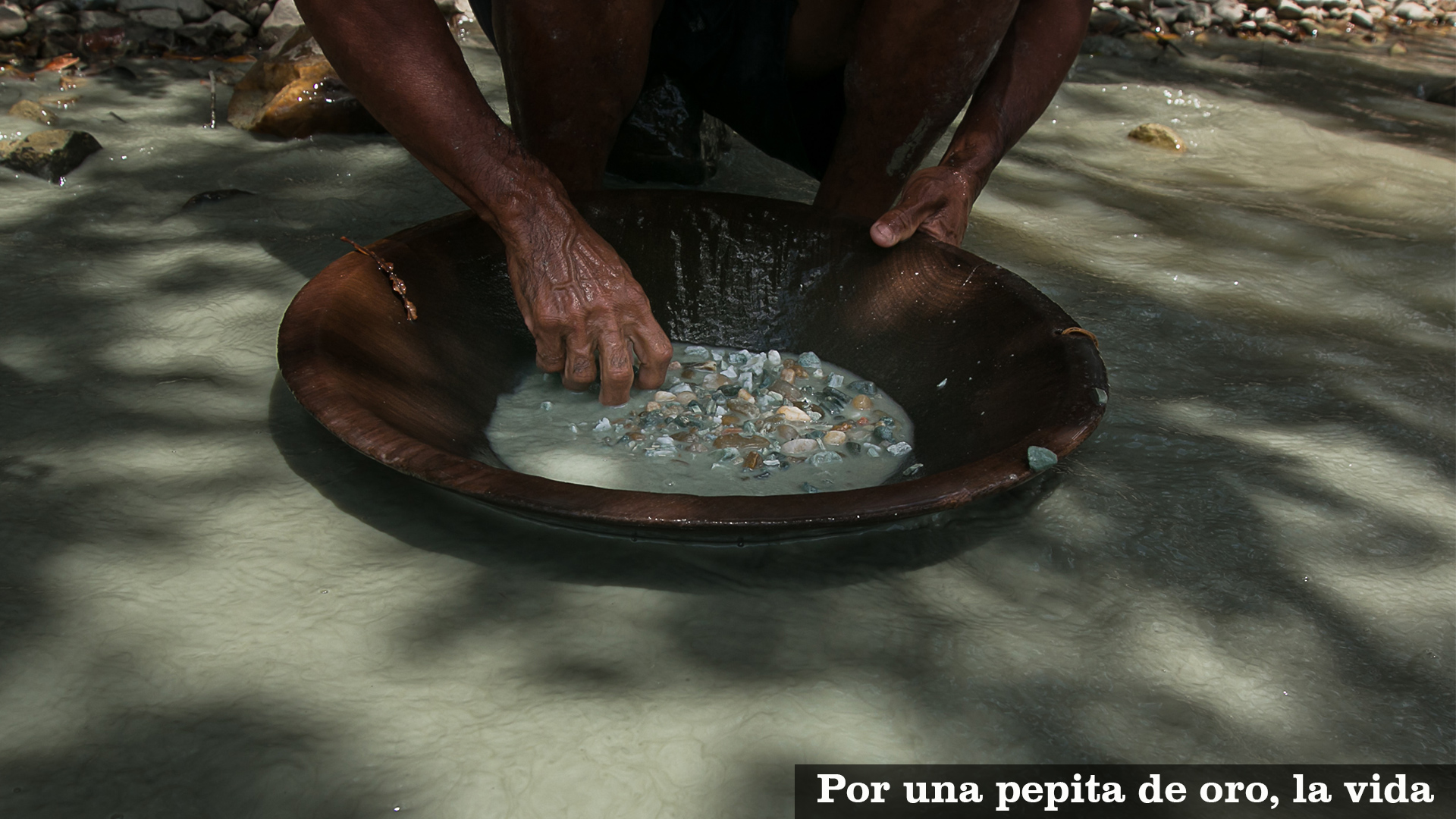La tierra va del piso al saco, del saco al río y del río a otro saco que va en la espalda hecho oro de vuelta al campamento. En el río se sientan todos a menear la batea, limpiando la tierra de a poquito y amontonando los puntos de oro en un pote de plástico. El metal se ve apenas cuando lo sacan, porque el resto de la mina es toda ropa desgastada, botas viejas y hombres sudados.