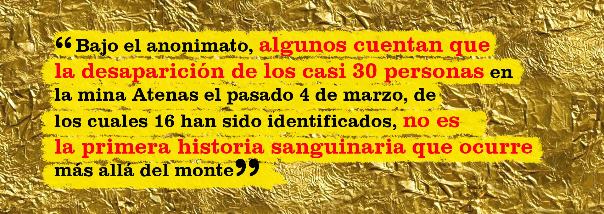 Las grandes son riesgosas. El miedo del municipio Sifontes se respira en el aire porque todos están inmersos en la “guerra de mafias”. Pocos quieren hablar del tema, a menos que se reserve su identidad. Las mafias que cobran “vacuna” mantienen el control y logran callar a la mayoría. El que declara sabe que se arriesga a represalias. Pero bajo el anonimato, algunos cuentan que la desaparición de los casi 30 personas en la mina Atenas el pasado 4 de marzo, de los cuales 16 han sido identificados, no es la primera historia sanguinaria que ocurre más allá del monte.