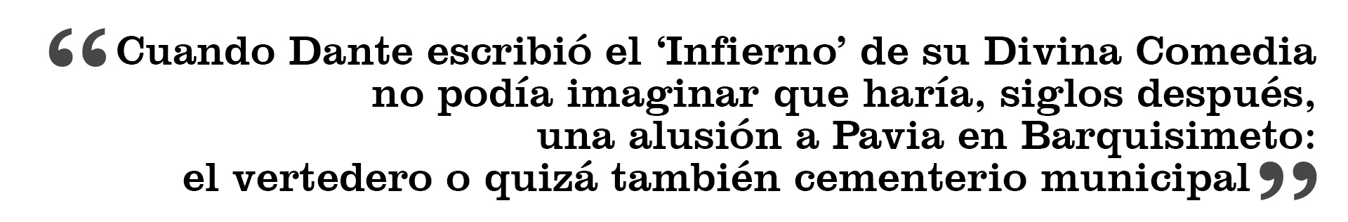 Después de la duda natural, el camino se pintaba salvaje. Lo fue. Se abría un paisaje gris, seco, hediondo. La planicie de Pavia tiene 232 hectáreas y recibe alrededor de 900 toneladas de basura al día, aunque Barquisimeto produce cerca de 1200. El problema de los desechos en la región no es nuevo. Pasan quincenas completas sin aseo porque Imaubar, el instituto encargado, está quebrado. Se necesitan, al menos, 10 unidades de recolección más para poder cubrir la demanda y muchos camiones están parados por falta de repuestos y divisas. En algunas zonas de la ciudad se consiguen montañas de basura, con gusaneras, moscas y demás.