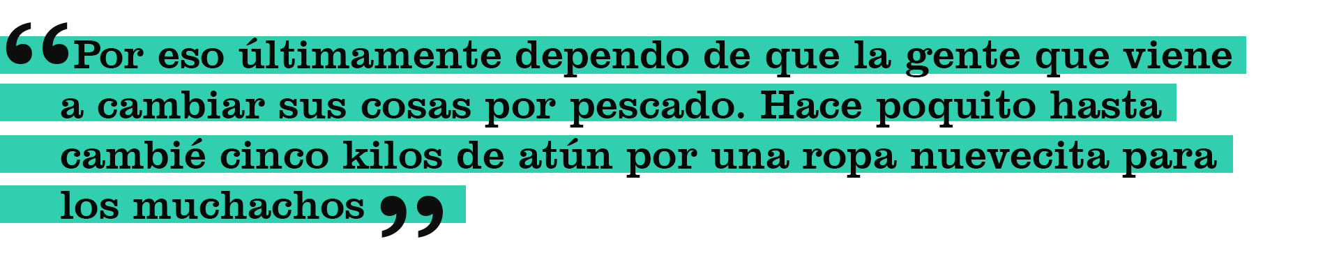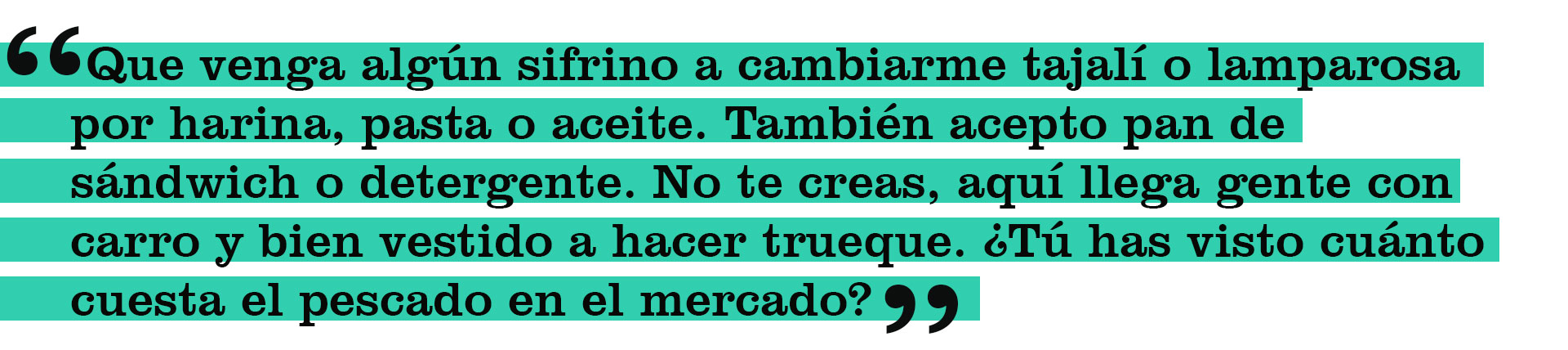 Marlenys Guaita tiene 19 años y dos hijos. Vive a orillas de la playa, en la aldea de pescadores de Los Boqueticos. Cuando su marido regresa en las mañanas, a eso de las nueve, empieza el ruego. “Que venga algún sifrino a cambiarme tajalí o lamparosa por harina, pasta o aceite. También acepto pan de sándwich o detergente. No te creas, aquí llega gente con carro y bien vestido a hacer trueque. ¿Tú has visto cuánto cuesta el pescado en el mercado? Yo hago colas también, pero eso es horrible. Yo no soy peleonera y no tengo mística de ir a caerme a trompadas con una bachaquera para que no se me colee. Además, yo tengo que llevar y buscar a mi hijo de siete años que está en el colegio y cargar encima a la muchachita que tiene tres añitos. Cuando consigo con quién dejarla voy a limpiar casas. Así que dime tú en qué momento voy a hacer colas. Por eso últimamente dependo de que la gente que viene a cambiar sus cosas por pescado. Hace poquito hasta cambié cinco kilos de atún por una ropa nuevecita para los muchachos. Le señora dijo que cuando tuviera más que ‘truequear’ iba a pasarse, pero todavía la estoy esperando».