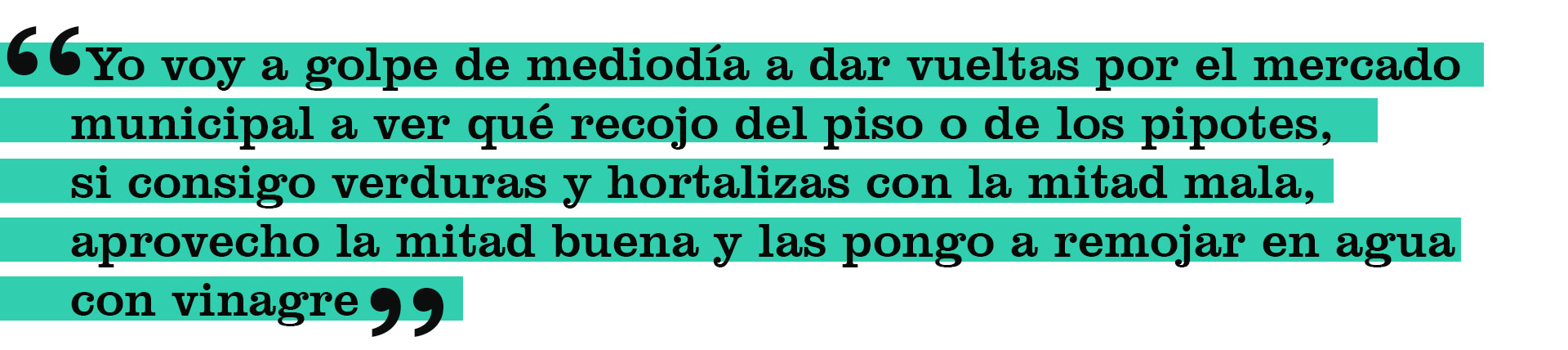 “Yo voy a golpe de mediodía a dar vueltas por el mercado municipal ―explica Pancho López, un abuelo de 75 años que esperaba autobús en la parada del referido mercado― a ver qué recojo del piso o de los pipotes, si consigo verduras y hortalizas con la mitad mala, aprovecho la mitad buena y las pongo a remojar en agua con vinagre. Eso me ha salvado en los últimos meses, con dos papas y media zanahoria por lo menos no me acuesto con el estómago vacío. Yo no tengo pensión, mis hijos me mandan a fin de mes pero la cosa está muy dura para ellos, que tienen muchachitos pequeños que mantener. Yo trato de no joderlos mucho. Por ahí en Chuparín, por donde vivo, siempre hay alguien que me lanza un pan o un guarapo y yo me aguanto. Yo era zapatero, pero las manos no me funcionan como antes.”