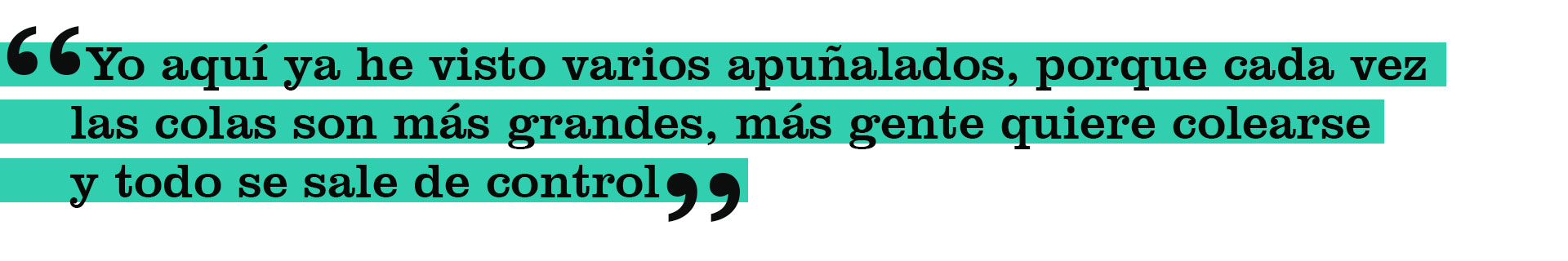 Amaranta Matos, ama de casa de 45 años, asiste puntualmente el día de su cédula para hacer la cola en el concurrido abasto del Chino Julio, en la avenida principal de Pozuelos. Empieza a merodear desde las 6 am, sin saber si vendrá o no algún camión de alimentos. “Esto se está poniendo cada vez peor, déjame decirte. Las malandras bachaqueras son las que tienen una mafia para distribuir la cola, y ay de ti si te atreves a reclamar: te zampan tu coñazo, porque esas pueden más que la policía, aunque nunca falta uno más arrecho que empieza a repartir cascazos. Yo aquí ya he visto varios apuñalados, porque cada vez las colas son más grandes, más gente quiere colearse y todo se sale de control; últimamente el tumulto de gente se coge todos los canales de la avenida y no pueden pasar carros. Y uno como si nada. Pero me estoy hartando, de verdaíta. Todos los días tengo salir a ver qué encuentro, que si la medicina de mi mamá o dónde venden el pollo más barato. Extraño la época en que podía quedarme en las tardes viendo novelas. Hija, ya ni le doy de comer a la loca de allá abajo, ¡es que hay mucha preocupación!”.