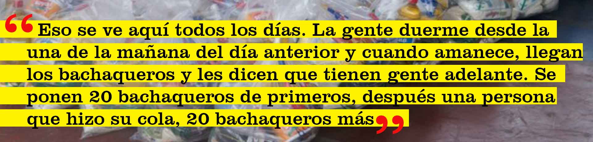 Antes de que se asomen los primeros rayos del sol, Alicia Ortiz ya está en la calle todos los jueves. Desde hace tres semanas, su marido la deja a las 3:30 de la madrugada en el supermercado Unicasa de El Paraíso para ver si tiene suerte y logra comprar algunos productos que ocupen los estantes vacíos de su cocina. Vive en San Martín, pero migró al sector vecino desde que en el Central Madeirense de Capuchinos presenció un intento de saqueo y dejaron de vender artículos regulados. Madruga porque antes del amanecer un hombre con cicatrices en el rostro les quita la cédula a un número arbitrario de personas que estén en la cola. Él es uno de los líderes de bachaqueros y, horas más tarde, cuando la Guardia Nacional que resguarda el recinto solicita las cédulas laminadas de los compradores, el sujeto entrega las requisadas a los presentes con las de un lote de personas que no se encuentran en el lugar. Los ausentes son bachaqueros que van apareciendo paulatinamente y se incorporan a la fila.