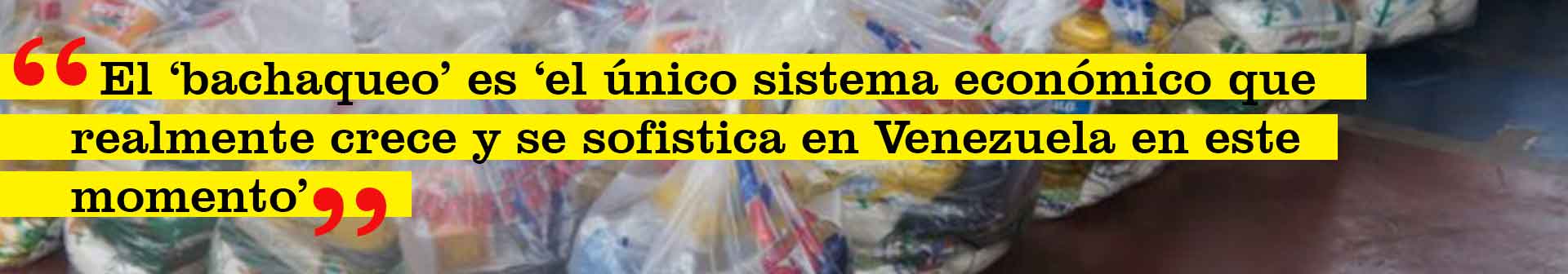 “Bachaquero” era un vocablo sin sentido hace menos de dos años en el país. Ahora todos tienen uno de confianza que funciona como dealer de alimentos, productos de higiene y medicinas. El director de la consultora Datánalisis, Luis Vicente León, asevera que 57% de los venezolanos admite recurrir a bachaqueros para comprar artículos. Considera que el “bachaqueo” es “el único sistema económico que realmente crece y se sofistica en Venezuela en este momento”. La red de revendedores es articulada y sus practicantes se clasifican en diferentes categorías. De acuerdo con León, están “1) los bachaqueros simples que revenden los productos que logran adquirir en una compra normal; 2) las personas que venden el puesto en una cola; 3) las personas que financian a otras para que hagan la cola, compren y le entreguen la mercancía para luego distribuirla; 4) los bachaqueros deluxe que le compran a los bachaqueros simples y luego aumentan el precio para venderlo por internet o te lo llevan hasta tu casa y 5) el bachaqueo de extracción, que es comprar en Venezuela para sacar mercancía al exterior y obtener moneda dura”.