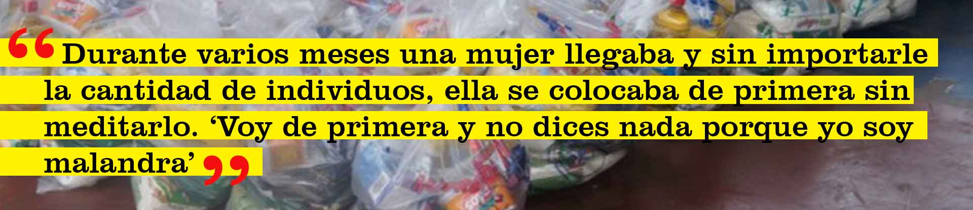 Como una larga fila de hormigas se aglomeran las personas en las afueras del Central Madeirense de La Alameda en Santa Fe. Durante varios meses una mujer llegaba y sin importarle la cantidad de individuos, ella se colocaba de primera sin meditarlo. A quien la cuestionara le enseñaba el cuchillo que escondía en su pantalón y le amenazaba con cortarle la cara. “Voy de primera y no dices nada porque yo soy malandra”, eran las palabras con que se presentaba según recuerda Ingrid Cabrera, habitante del barrio Las Minas de Baruta. “Ya esa mujer no se aparece más por aquí. Llegó una más brava que ella y la desplazó, pero la intimidación es la misma. Es mejor dejarse colear a terminar bañado en sangre”, opina Cabrera.