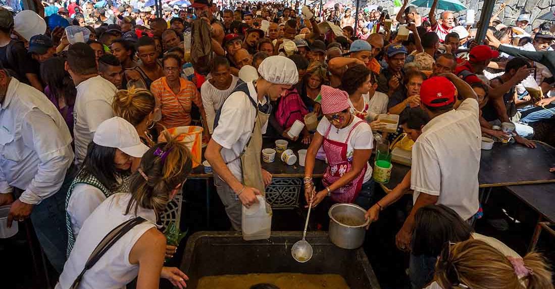 La cola de la sopa está larga, a reventar. Entonces ocurre lo más esperado: un voluntario abre la olla. Como en una escena de The Walking Dead, los hambrientos comienzan la carrera. Potes vacíos de todo tipo y origen van pasando uno tras otro para recibir el maná de aquel cucharón. Unos encima de otros, se hacen señas con los dedos de cuántas personas son para pedir la cantidad de sopa necesaria. El candidato ya ha llegado y desde una tarima brama su discurso. No importa si le hacen más caso a él o al bocado de comida gratis; para muchos, el único del día.