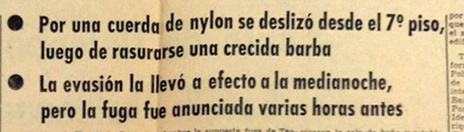 Al día siguiente su fuga fue la noticia más comentada en la prensa. El Nacional le dedicó media página y dos grandes fotos, un retrato del guerrillero con muletas y el cabello negro, y otra de la ventana por la que salió. El primer párrafo de la noticia rezaba: “Teodoro Petkoff (…) logró fugarse del Hospital Central de las Fuerzas Armadas, donde se había recluido por estar padeciendo una úlcera en el duodeno. El reo escapó deslizándose por una cuerda de nylon desde el séptimo piso del edificio del mencionado instituto asistencial”.