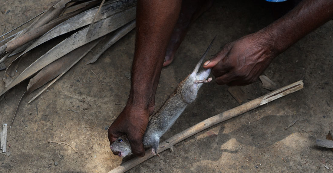 La rata trepa por el brazo de Phekan Manjhi, que intenta atraparla. Al final, consigue golpearle la cabeza fuertemente con un palo y matarla. Para los «comedores de ratas» de India, una de las comunidades más pobres del país, la comida pronto estará servida.