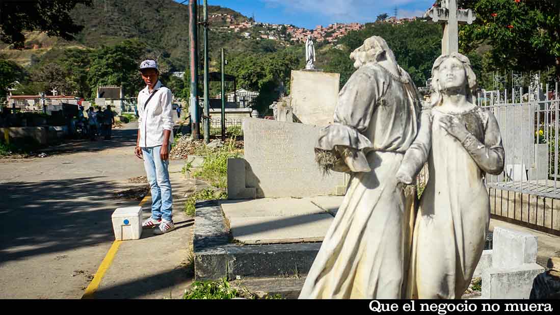 “Chupis, chupis”, grita Carlos* cada cierto tiempo con una cava de anime entre los pies. Aprovecha los domingos en la mañana para ir hasta el cementerio y vender los helados para matar el calor. Su punto es en una de las calles principales, al borde de la calzada, cerca de la entrada, al lado de una escultura de la Virgen María. Compra 70 unidades en el mercado, los vende por 1.500 bolívares y se va con algo en el bolsillo. “Aporto en mi casa y también estudio”.