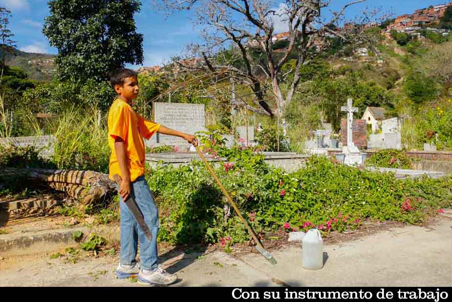Tiene 13 años y hace tres trabaja en la ciudad de los muertos, el cementerio más grande y antiguo de Caracas, ubicado al final de la avenida principal de la urbanización Santa Rosalía del municipio Libertador. Está en primer año de bachillerato y va todos los fines de semana, sin falta, a la necrópolis a arreglar las tumbas del camposanto, a petición de los familiares de quienes reposan bajo tierra. Hace malabares entre la educación y su trabajo.