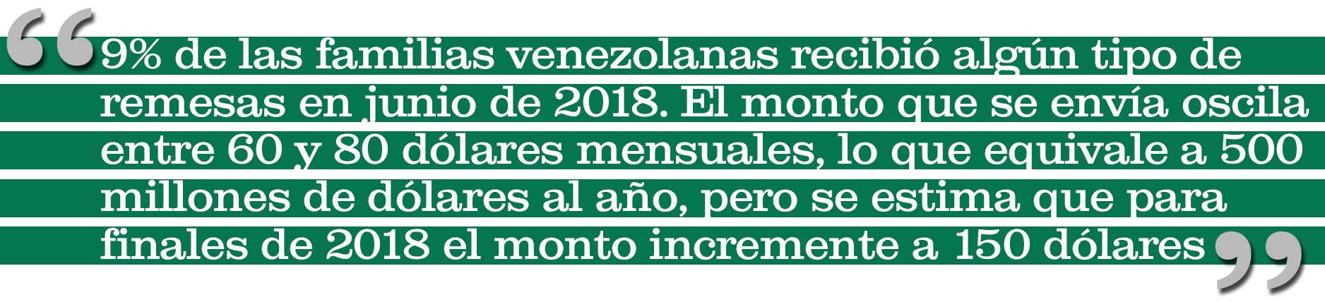 El presidente de Datanálisis, Luis Vicente León, precisó que 9% de las familias venezolanas recibió algún tipo de remesas en junio de 2018. La encuestadora reporta que el monto que se envía oscila entre 60 y 80 dólares mensuales, lo que equivale 500 millones de dólares al año, pero se estima que para finales de 2018 el monto incremente a 150 dólares debido a la pérdida de valor de la moneda nacional y la escasez de efectivo. De hecho, así como la inflación de julio superó el 100%, la devaluación en el mercado no oficial de la moneda nacional no superó el 10%, según cálculos de León. Por tanto, se necesitan más dólares para soportar el encarecimiento de los precios.