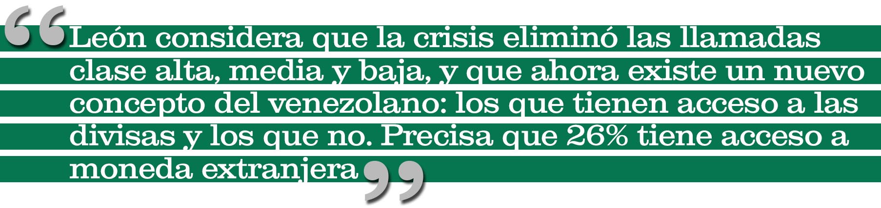 León considera que la crisis eliminó las llamadas clase alta, media y baja, y que ahora existe un nuevo concepto del venezolano: los que tienen acceso a las divisas y los que no. Precisa que 26% tiene acceso a moneda extranjera por sus ahorros, por su auto generación o por las remesas que recibe. Asegura que quienes forman parte de este fenómeno no son superiores a sus pares, pero tienen mayor capacidad de compra y, por ende, el fenómeno instaura una variable que los separa.