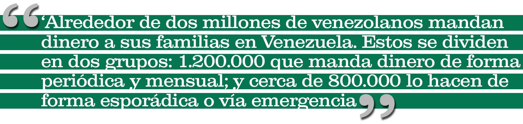 Oliveros estima que 80% de los migrantes venezolanos recurre a canales no oficiales para enviar dinero a sus familias pues a través de rutas legales, como el Dicom, perderían grandes cantidades de dinero, debido al control de cambio que mantiene una brecha importante con el mercado paralelo. Asegura que el impacto de las remesas se siente en todo el país, pero en mayor número lo notan las familias con menos recursos. “Alrededor de dos millones de venezolanos mandan dinero a sus familias en Venezuela. Estos se dividen en dos grupos: 1.200.000 que manda dinero de forma periódica y mensual; y cerca de 800.000 lo hacen de forma esporádica o vía emergencia”, asegura.