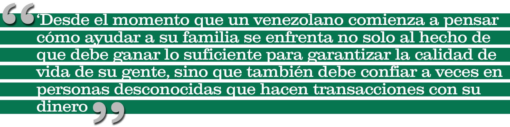 Magally Huggins, psicólogo social con especialización en criminología, considera que el fenómeno de las remesas genera tanto en los venezolanos que se van como en los que se quedan una profunda ansiedad y desesperación ante las posibilidades de estafa y amenazas de persecución y criminalización por parte del gobierno venezolano. “Desde el momento que un venezolano comienza a pensar cómo ayudar a su familia se enfrenta no solo al hecho de que debe ganar lo suficiente para garantizar la calidad de vida de su gente, sino que también debe confiar a veces en personas desconocidas que hacen transacciones con su dinero”, asegura.