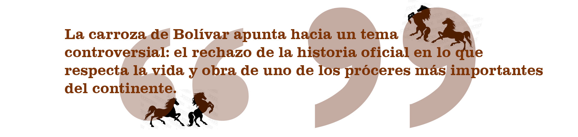 La novela histórica implica una responsabilidad de información, por lo menos así lo entendí yo. Hay que respetar los datos históricos, los hechos, el ambiente, infinidad de situaciones que “encadenan” en cierto modo el trabajo de imaginación, el único trabajo al que yo estaba acostumbrado en mis anteriores novelas. Pero creo que logré equilibrar estas dos vertientes con La carroza de Bolívar, es decir la historia, lo que ocurrió, y la otra historia imaginada (…) pero no será mi única novela histórica. La carroza de Bolívar apunta hacia un tema controversial: el rechazo de la historia oficial en lo que respecta la vida y obra de uno de los próceres más importantes del continente.