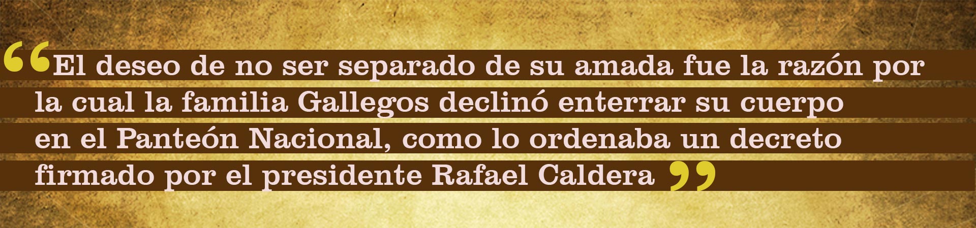 Muchas décadas atrás, paseando por El Valle —zona de Caracas donde residía la familia Arocha— él vio a tres hermanas sentadas en la ventana de una casa. Eso bastó para enamorarse de Teotiste Arocha y enviarle cartas a su madre, clamándole el permiso para ser su yerno. En 1912 se casaron y, aunque Teotiste falleció 38 años de matrimonio después, su recuerdo nunca se desprendió de Rómulo. En una visita al Cementerio del Sur —donde fue sepultada cuando retornaron a Venezuela— le dijo a Sonia: “Prométeme que nunca me sacarás de aquí. Siempre estaré al lado de Teotiste”. El deseo de no ser separado de su amada fue la razón por la cual la familia Gallegos declinó enterrar su cuerpo en el Panteón Nacional, como lo ordenaba un decreto firmado por el presidente Rafael Caldera.