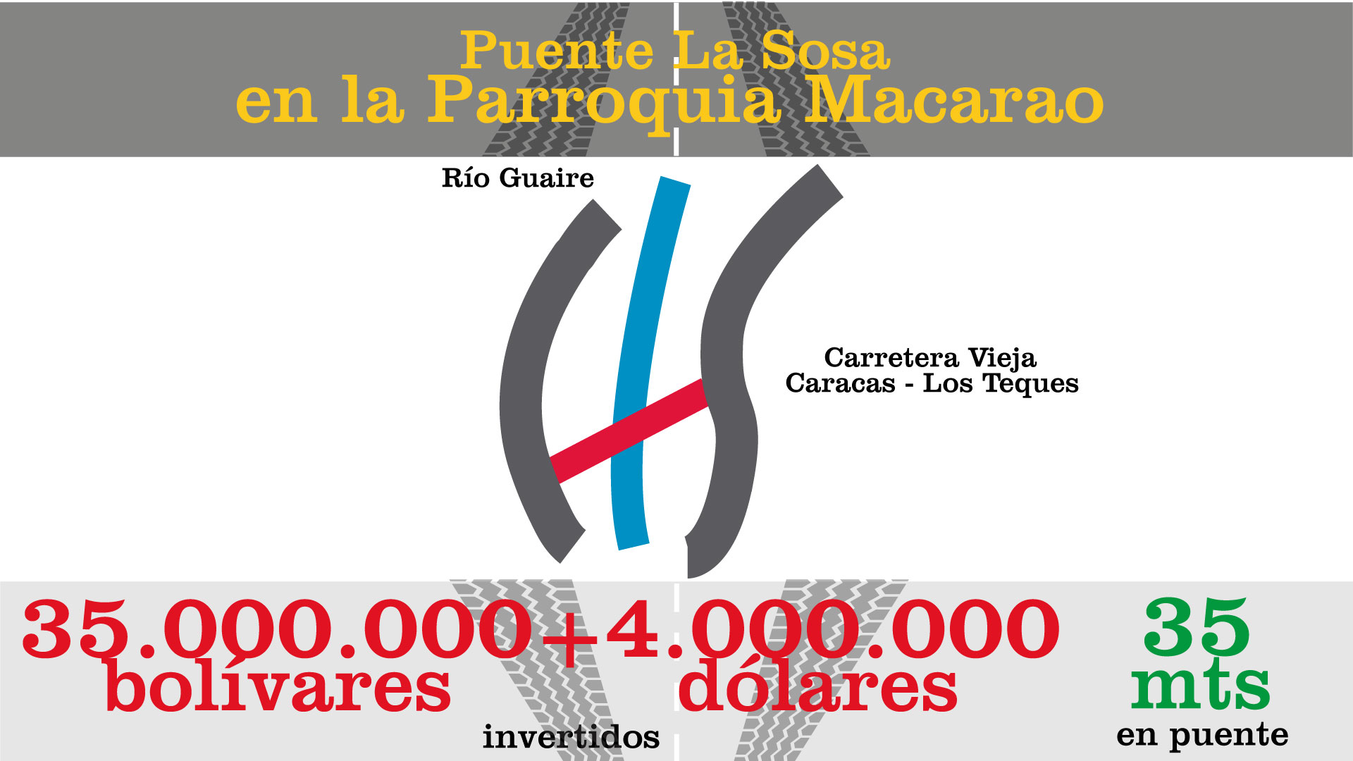 Sin embargo, los bolívares le quedaron cortos al ministerio. Bajo el plan Socialismo Territorial, activado por el Ejecutivo Nacional, el estreno del puente La Sosa en la parroquia Macarao necesitó 4 millones de dólares con los ya aprobados 25 millones de moneda local. “Con el objetivo de vigorizar el trabajo del presidente, Nicolás Maduro”, el Alcalde de Caracas, Jorge Rodríguez, la Jefa de Gobierno del Distrito Capital, Jacqueline Farías, el Vicepresidente de la Asamblea Nacional, Darío Vivas y demás afectos estrenaron el resultado: una conexión de tan solo 35 metros a la carretera vieja Caracas-Los Teques.