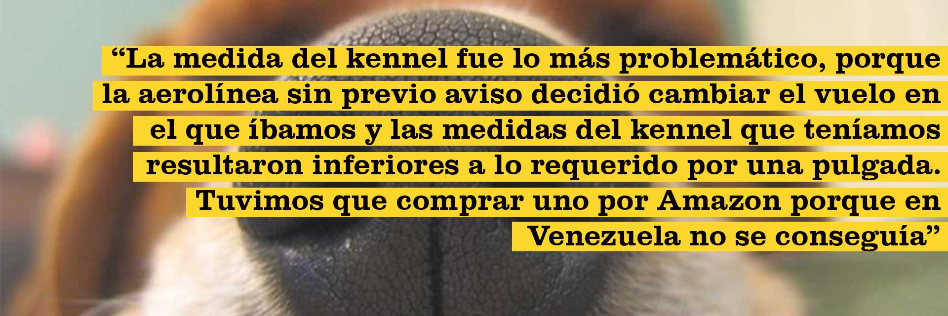 La información no es lo único escaso. Conseguir el equipo necesario para transportar a las mascotas, y que se ajuste a su tamaño, resulta harto complicado. Hace un año, Jiménez consiguió kennels para Locky y Cindy en una tienda Don Perro, en Caracas, que lograron llegar a Canadá sin problemas. Pero a medida que la crisis se profundiza, la disponibilidad de los compartimientos se hace más exigua a la par que sus precios se ensanchan. En el portal web MercadoLibre, oscilan desde los “modestos” 12 mil hasta los impensables 297 mil bolívares. “La medida del kennel fue lo más problemático, porque la aerolínea sin previo aviso decidió cambiar el vuelo en el que íbamos y las medidas del kennel que teníamos resultaron inferiores a lo requerido por una pulgada. Tuvimos que comprar uno por Amazon porque en Venezuela no se conseguía”, explica De Falco.