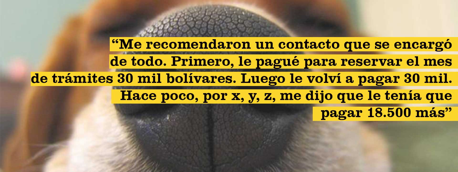Para que Maní pueda volar a Centroamérica, su amo confiesa haber tomado el camino “fácil y costoso” de contratar a un gestor que se encargó del papeleo de su canino “a dólar oficial”. Entre permisos y exámenes, su dueño ha gastado alrededor de 10 salarios mínimos: “Me recomendaron un contacto que se encargó de todo el procedimiento. Primero, le pagué para reservar el mes de trámites 30 mil bolívares. Luego le pagué 30 mil o un poco más. Hace poco, por x, y, z, me dijo que le tenía que pagar 18.500 más”, cuenta el fotógrafo.