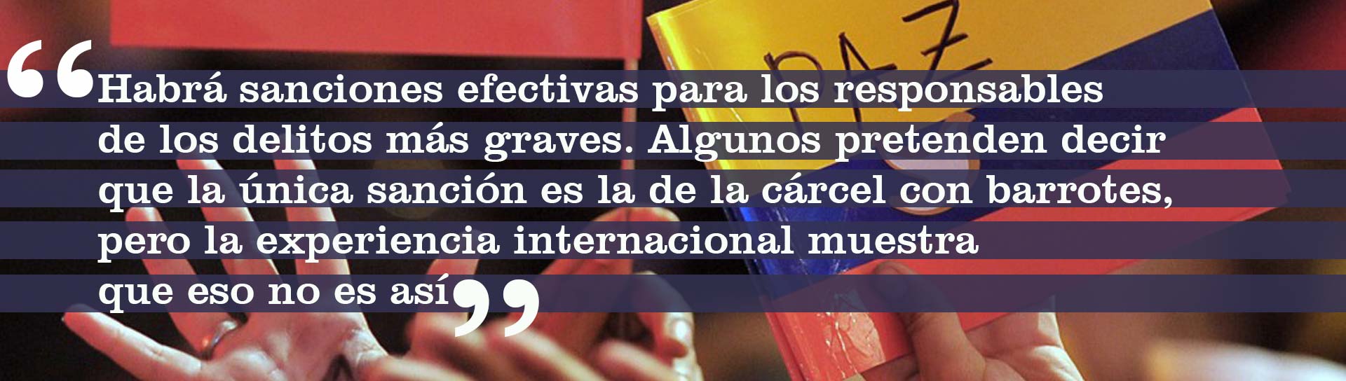 Este fue el tema más espinoso entre las partes en el caso de las negociaciones llevadas adelante en La Habana, Cuba. El Acuerdo establece una jurisdicción especial para la justicia transicional y señala que “las sanciones tendrán como finalidad esencial satisfacer los derechos de las víctimas y consolidar la paz. Deberán tener la mayor función restaurativa y reparadora del daño causado, siempre en relación con el grado de reconocimiento de verdad y responsabilidad que se haga ante el componente de Justicia”.