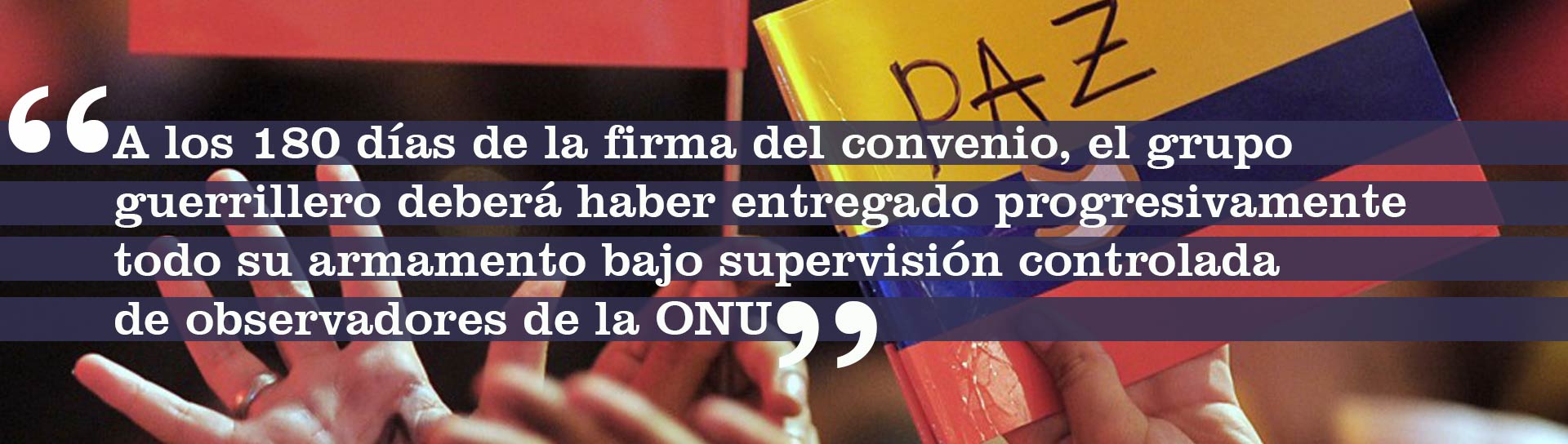 Las FARC, con el apoyo del Gobierno, podrán dar cursos de formación a la tropa que le facilite su normalización. A los 180 días de la firma del convenio, el grupo guerrillero deberá haber entregado progresivamente todo su armamento bajo supervisión controlada de observadores de la ONU y en esa misma fecha debe abandonar los campamentos para incorporarse a la vida civil.