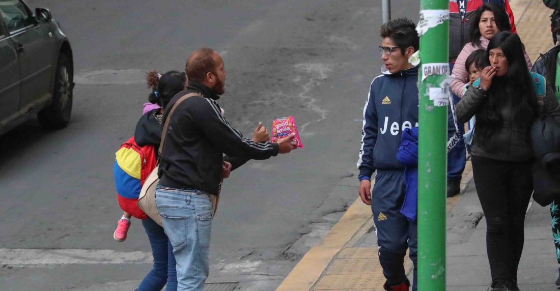 Llegó a Bolivia con tres niños, después de que el padre de sus hijos decidiera quedarse en Caracas, y ahora vende caramelos en el centro de La Paz, su única fuente de ingresos lejos de su tierra. La mujer reprime las lágrimas mientras cuenta que su salario como asistente de un ingeniero del Gobierno en Venezuela no llegaba para dar de comer a su familia. «Un sueldo semanal en Venezuela está en 2 dólares. ¿Quién sobrevive con eso?», denuncia.