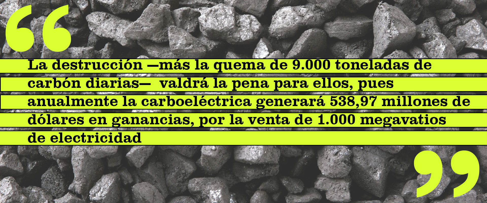 Estas son las cuentas que hace Portillo: las minas Norte y Paso Diablo tienen carbón hasta el año 2022, por lo que, a partir de ese momento, se requerirá abrir las minas Socuy Norte y Socuy Sur. En esa zona se podrán obtener 172 millones de toneladas y, más adelante, se podrán producir otras 252 millones de toneladas si se explota el carbón que se encuentra en el lecho del río Socuy. Toda la destrucción —más la quema de 9.000 toneladas de carbón diarias— valdrá la pena para ellos, pues anualmente la carboeléctrica generará 538,97 millones de dólares en ganancias, por la venta de 1.000 megavatios de electricidad. La idea, señala un informe de Homo et Natura, será expandir esta cantidad a 3.000 megavatios.