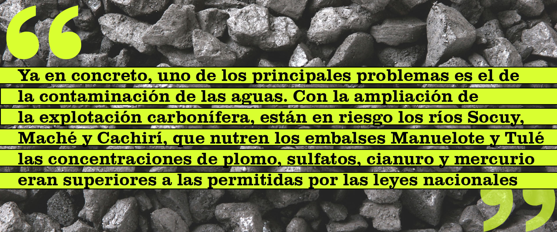 Ya en concreto, uno de los principales problemas es el de la contaminación de las aguas. Con la ampliación de la explotación carbonífera, están en riesgo los ríos Socuy, Maché y Cachirí, que nutren los embalses Manuelote y Tulé, y que, a su vez, surten a Maracaibo, La Concepción, parte de Mara y San Francisco. Hasta el momento, se ha demostrado que la minería de carbón altera la composición de los cuerpos de agua. El Informe ejecutivo de la situación actual de la explotación de carbón en el estado Zulia, elaborado por el Ministerio del Ambiente y publicado en 2005, señaló que en el caño Santa Rosa, por ejemplo, las concentraciones de plomo, sulfatos, cianuro y mercurio eran superiores a las permitidas por las leyes nacionales, de acuerdo con muestras tomadas entre 2002 y 2005.