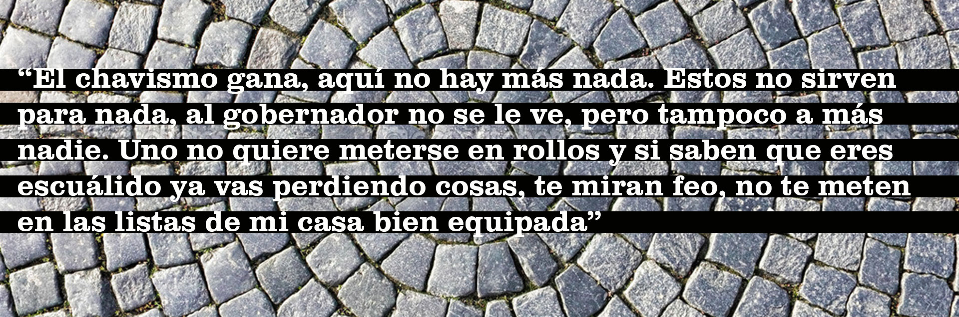 Los comensales del restaurancito de pollo a la broaster Mi Comida se quejan de la falta de cerveza. “Solo tengo Zulia”, dice el mesonero a todos los que piden. Al final, luego del refunfuño, todos aceptan la cerveza de botella verde. “Negra no hay en ningún lado”, se lamenta Raúl, “pero qué carajo”. Las conversaciones con los habitantes locales se van volviendo rutinarias hasta que se les cambia el tema. Algunos no quieren hablar de política, pero otros se aventuran: “Sí, todo el mundo es chavista”, comenta Raúl cuando ya va por la tercera birra. “Es que, coño, es lo que hay. Allá a veces vienen los carajitos de Primero Justicia, pero nada, no convencen. Además el gobierno hace cosas, no muy seguido pero las hace: operativos, vainas”. Y remata: “Yo no voy a votar por los escuálidos”.