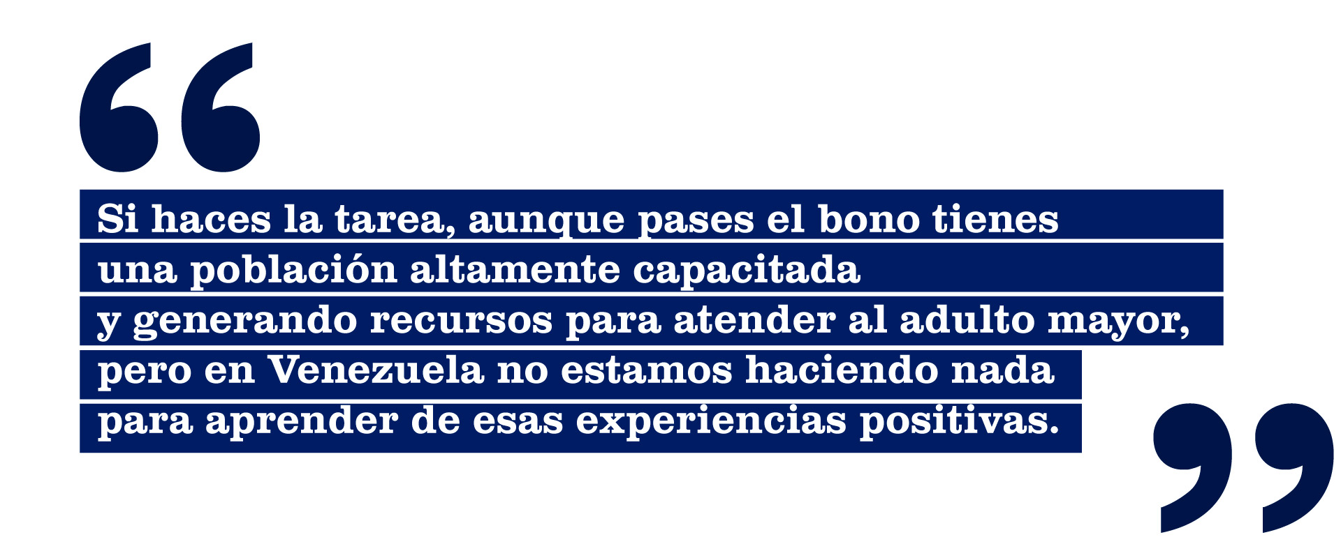 En Europa, la transición demográfica terminó, dejando una población adulta con grandes necesidades de atención –como en los casos de Italia y España- y una menor cantidad de personas laboralmente activas. “Si haces la tarea, aunque pases el bono tienes una población altamente capacitada y generando recursos para atender al adulto mayor, pero en Venezuela no estamos haciendo nada para aprender de esas experiencias positivas”, lamenta Zúñiga. Para 2050 faltan solo tres décadas, y el tiempo perdido no perdona.