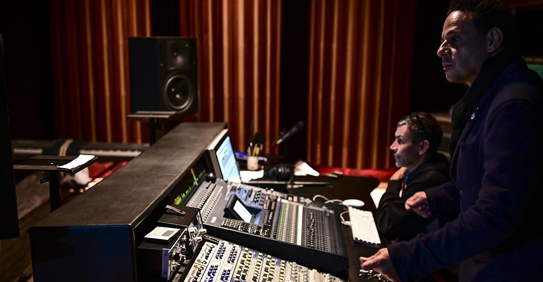 En la sala de mezclas, Blanco baila y asiente con la cabeza mientras en una cabina vidriada el percusionista Oscar Alcaíno, de 60 años, sacude una coctelera con arena frente al micrófono.