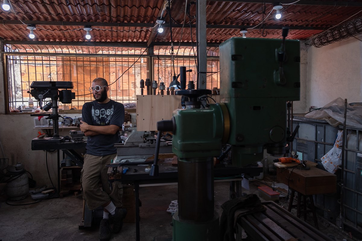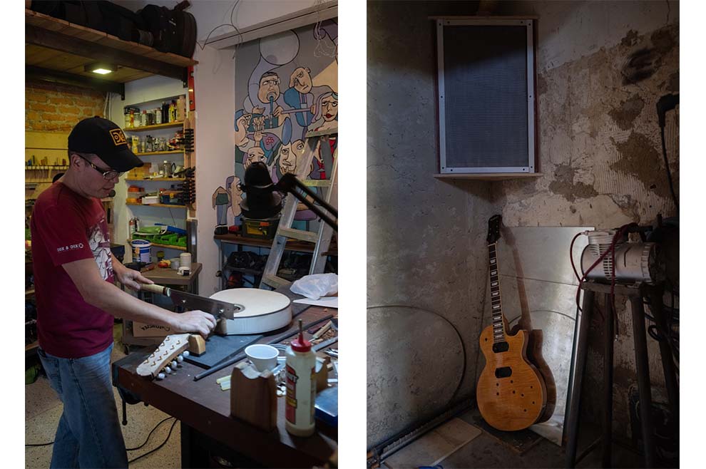 Luis Felipe Santos en su taller de lutería donde trabaja una comunidad de artistas. El mural a su derecha fue pintado durante el corte de energía en marzo que duró 5 días.