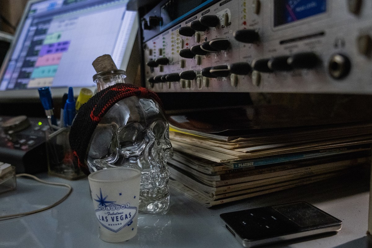 Allí tiene un gran mueble con una consola de sonido usada, unas cornetas que no registran todas las frecuencias, el teclado que adquirió con una media debajo de las teclas para que no se movieran y cables adaptados para para que sirvan porque no hay dinero para otros, paneles acústicos caseros en las paredes y una marca: Poseidón.