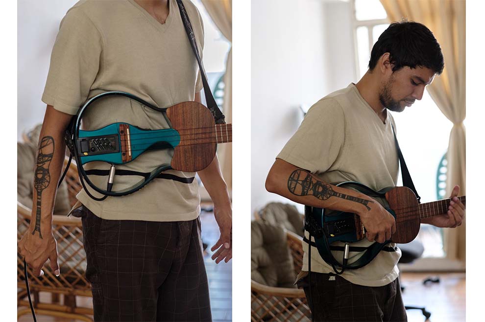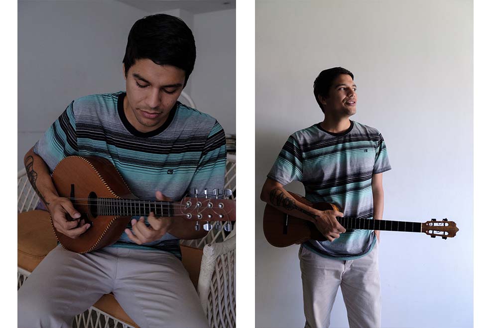 José David Lunar toca el cuatro, un instrumento venezolano tradicional, en la banda Song3.
