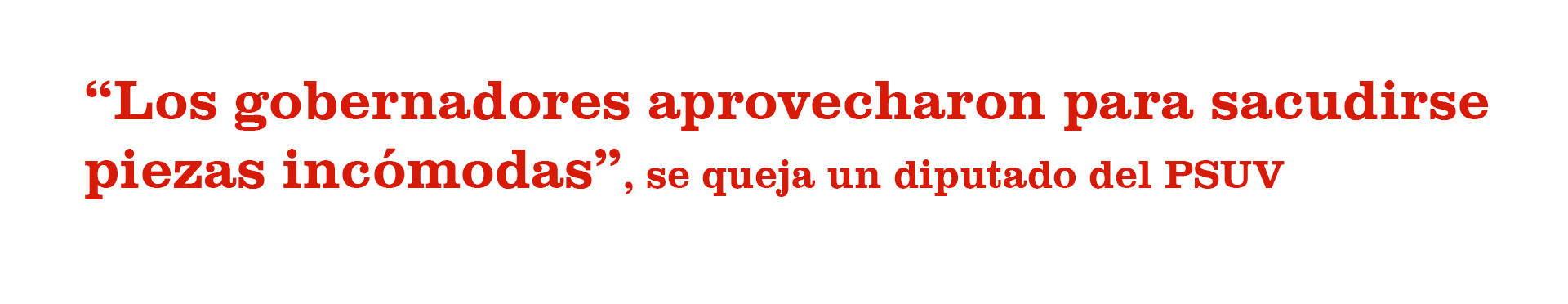 “Los gobernadores aprovecharon para sacudirse piezas incómodas”, se queja un diputado del PSUV. En ese grupo incluye a sus colegas Jesús Cepeda —Guárico— y José Rafael Ávila de Carabobo. El primero mantuvo un enfrentamiento público con Ramón Rodríguez Chacín, a quien calificó como un “engendro dedicado a perseguir a dirigentes políticos” en declaraciones recogidas por El Nacional el 29 de junio de 2013. En el caso de Ávila, promotor de la “agricultura familiar” para combatir el desabastecimiento, se ha dicho que está distanciado de Francisco Ameliach. La ficha que desplazó a ese presunto “incómodo” resultó ser Miguel Ángel Flores, quien fuera secretario del despacho de Ameliach y aspirante a la Alcaldía de Valencia.