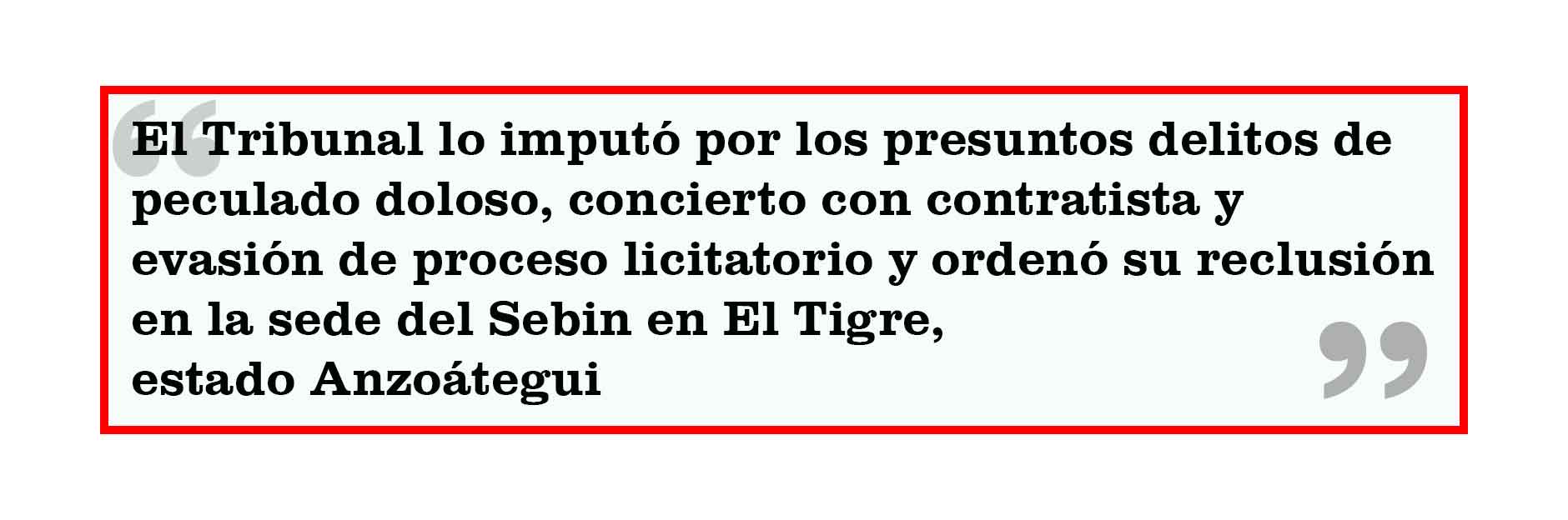 Dos días después, el Tribunal lo imputó por los presuntos delitos de peculado doloso, concierto con contratista y evasión de proceso licitatorio y ordenó su reclusión en la sede del Sebin en El Tigre, estado Anzoátegui, en donde está detenido desde entonces, lejos del pueblo que lo eligió y lo reafirmó como Alcalde.