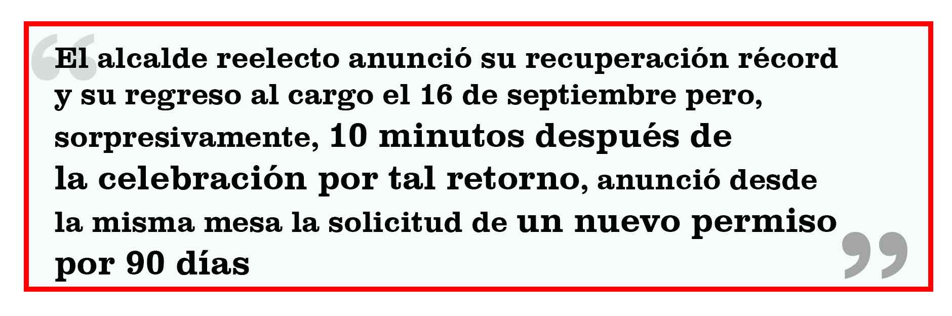 Pero López, aparentemente enterado de la jugada y obligado a responder, volvió a su escritorio, desafiando la orden de ceder el paso en la municipalidad. Así, el alcalde reelecto anunció su recuperación récord y su regreso al cargo el 16 de septiembre pero, sorpresivamente, 10 minutos después de la celebración por tal retorno, anunció desde la misma mesa la solicitud de un nuevo permiso por 90 días: un ardid para evitar la declaratoria de ausencia absoluta y con ello el llamado a elecciones antes de cumplirse los dos años de su segundo mandato.