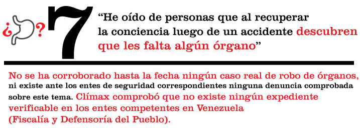 Hay miedo ante la idea de ser donante. Decenas de mitos urbanos, que despiertan la imaginación del individuo, orbitan alrededor de esta necesaria práctica. Un sinnúmero de historias fascinantes para escribir un relato de ficción resultan perjudiciales a la hora de formar la cultura de donantes en Venezuela. Clímax presenta el siguiente esquema con 10 miedos infundados que son refutables en su totalidad
