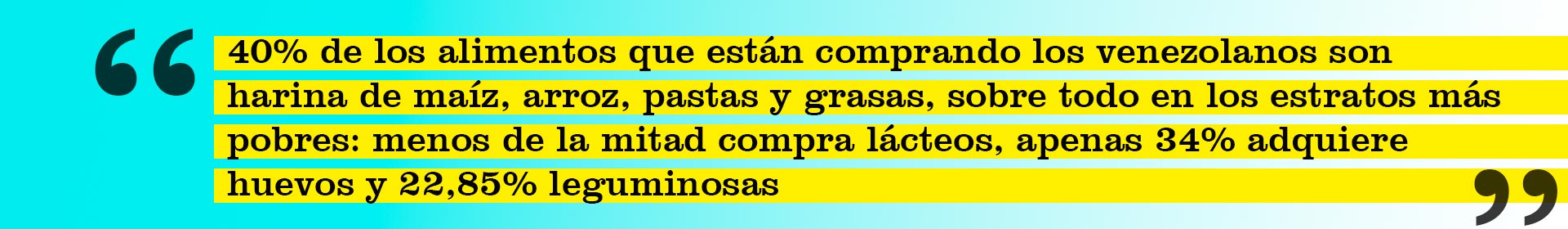 En general, el 40% de los alimentos que están comprando los venezolanos son harina de maíz, arroz, pastas y grasas, sobre todo en los estratos más pobres: menos de la mitad compra lácteos, apenas 34% adquiere huevos y 22,85% leguminosas. Las frutas, los tubérculos y las bebidas se convirtieron en un lujo del que menos de un tercio de la población puede disfrutar.