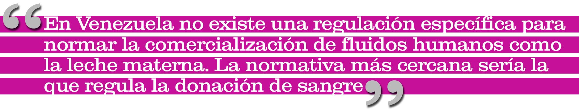 En Venezuela no existe una regulación específica para normar la comercialización de fluidos humanos como la leche materna, por lo que se abre un vacío legal que pone en riesgo la vida y salud de lactantes. La normativa más cercana sería la que regula la donación de sangre, pero al tratarse de un acto voluntario sin ánimo de lucro, no contempla los riesgos que pueden derivarse de un mercado paralelo sin regulación de un producto como la leche humana cuyo consumo implica un alto riesgo biológico.